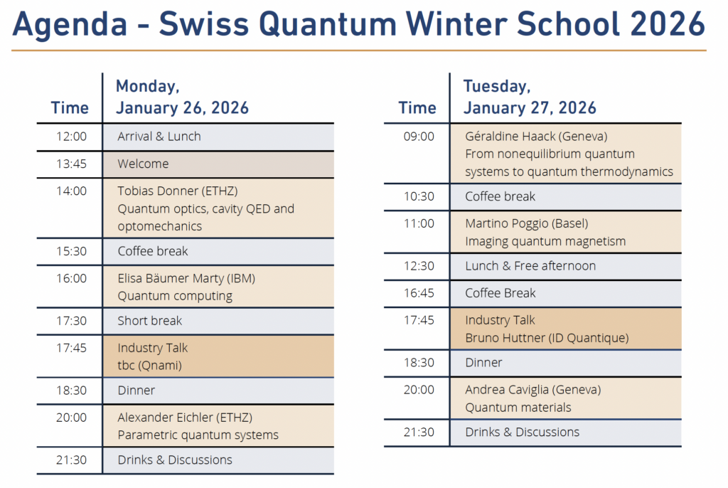 The inaugural Swiss Quantum Winter School will take place at the Hotel Terrace in Engelberg from January 26-28, 2026. It is for first-year PhD students.